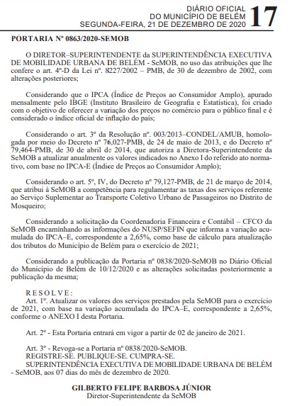 Zenaldo deixou de presente para a população, neste começo de 2021, um conjunto de reajustes nos valores cobrados para licenciamentos e autorizações para veículos no município de Belém. A portaria Nº 0863/2020-SEMOB foi divulgada no Diário Oficial do município no dia 21 de dezembro de 2020, e assinada pelo antigo diretor-superintendente da Semob, Gilberto Felipe Barbosa Junior.
