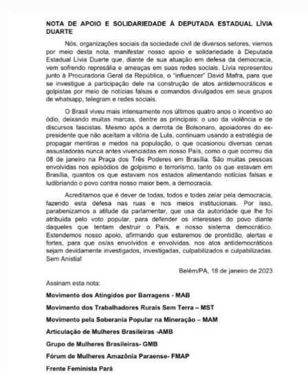 A deputada estadual eleita Lívia Duarte (PSOL/PA), recebeu uma nota de apoio e solidariedade assinada por mais de 25 entidades da sociedade civil paraense, após ser alvo de diversas ameaças partidas de seguidores e simpatizantes do influencer e blogueiro paraense bolsonarista Davi Mafra, além de grupos extremistas envolvidos com os atentados de 8 de janeiro em Brasília, atuantes nas redes sociais.