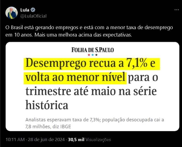 Nas redes, Lula comemorou e usou o índice para alfinetar o mercado, que tem feito projeções pessimistas e fora da realidade sobre a economia brasileira. “O Brasil está gerando empregos e está com a menor taxa de desemprego em 10 anos. Mais uma melhora acima das expectativas”.