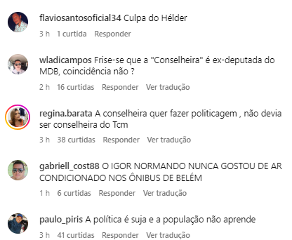 “Por que o TCM não vê as irregularidades dos atuais ônibus? Os ônibus rodando totalmente sucateados, com as rodas saindo, bancos quebrados sem nunca verem uma limpeza com motoristas (não todos) mal educados, transportando passageiro de forma ilimitada, tendo pessoas penduradas na porta, outras sentadas nas escadas?”, disse um internauta, no perfil do jornal Diário do Pará.