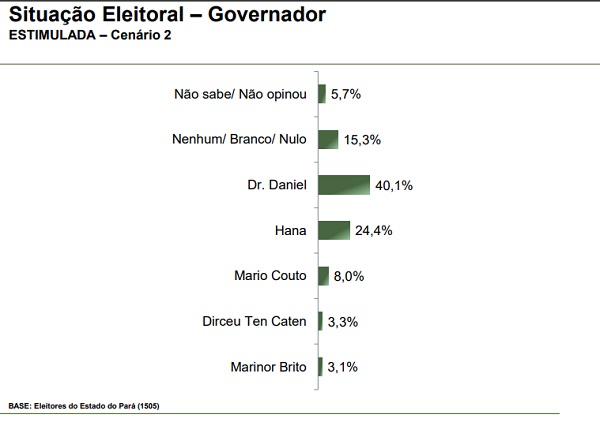 No cenário estimulado, quando os nomes dos candidatos são apresentados, Dr. Daniel amplia a vantagem e alcança 30,4% das intenções de voto. Em seguida aparecem Hana, com 21,1%, e o delegado Éder Mauro, com 19,3%. O ex-governador Simão Jatene registra 7,7%, enquanto Paulo Rocha soma 5,0%. A vereadora Marinor Brito (PSOL) aparece com 1,8%.
