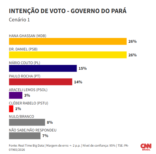 No primeiro cenário de primeiro turno testado pelo instituto, Hana e Dr. Daniel aparecem com 26%, cada. Na sequência, os ex-senadores Mário Couto (PL) e Paulo Rocha (PT) surgem empatados tecnicamente, com 15% e 14%, respectivamente. A ex-deputada estadual Araceli Lemos (PSOL) tem 3% e o ex-vereador de Belém, Cléber Rabelo (PSTU), 1%. Votos nulos e brancos somam 8%, enquanto 7% não sabem ou não responderam.